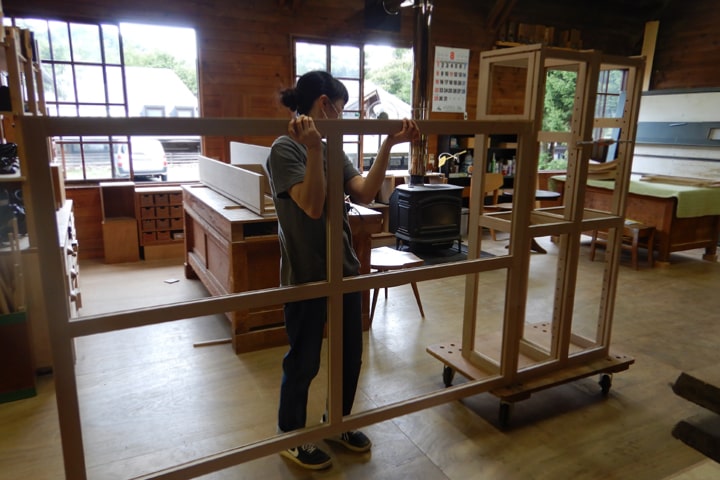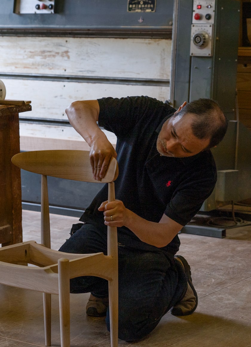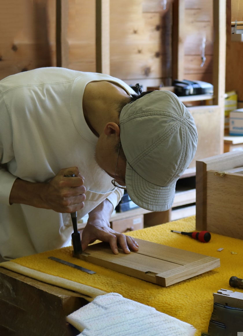 その技は、木造建築はもちろん、家具造りにも生かされています。テーブルなどの天板の反りを抑える「蟻桟(ありざん)」、食器棚や書棚など箱物の強固な構造体となる「框組み(かまちぐみ)」、テーブルや椅子の強度を求められる接合部に用いる「ほぞ組み」、箱の面を接合する「かんざし」など、伝統の技に独自の工夫を重ねて進化させ、100年使えるモノ造りを実践しています。