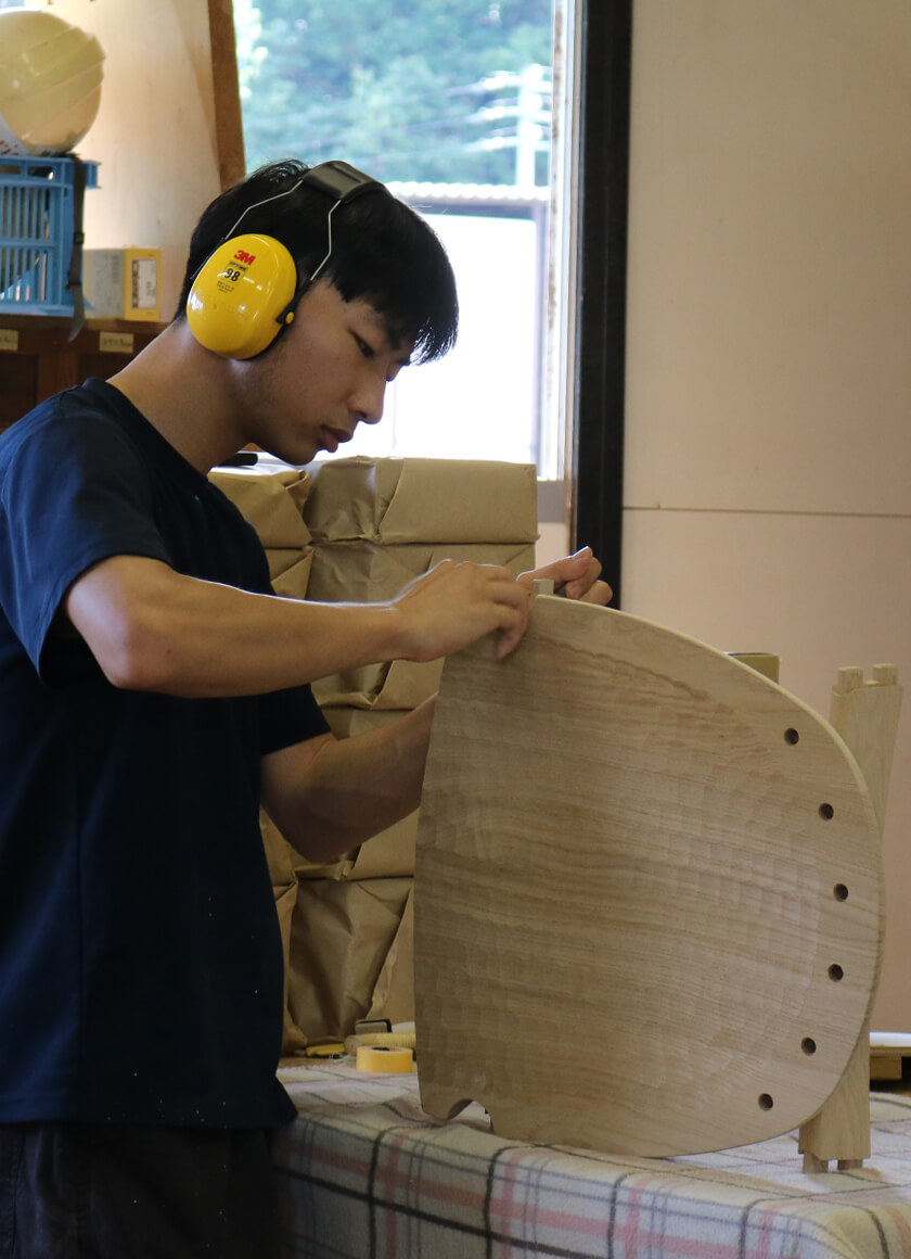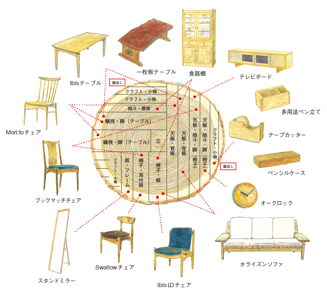 木は、伐った時季によって木材の性質は異なります。最良の状態で製品づくりに活用するために水分を多く含んでいる木はしっかり乾燥させるなど、植物としての木、木材としての木、それぞれの性質を知っている必要があります。また、家具や生活用品として使用する場合には、その木がどのような方法で加工され、どのように使われてきたのかを理解し、木の特性に適した使い方をすることによって、永く、快適に使っていただけます。