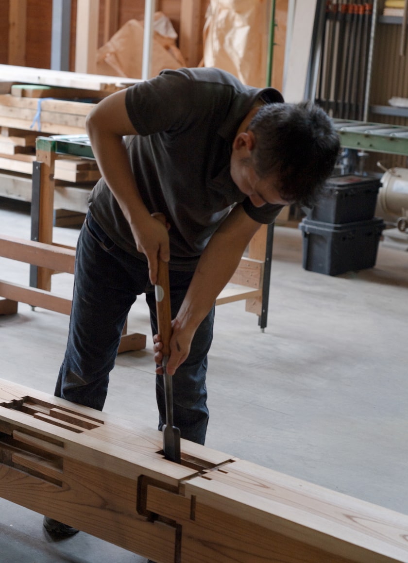 家の柱や梁をボルトで固定したり、椅子の座面と脚を金具で取り付けたりすれば、強度が増して長持ちすると思われがちです。しかし、実際にはボルトや金具は錆びて劣化し、地震や強い力が加わると金物が木の部材を破損させ、結果として家や家具の寿命を縮めます。金物に頼らず、木の特性と用途に応じて加工し組み上げる「木組み」は、伝統に裏打ちされた強さとしなやかさ、そして美しさを兼ね備えた工法。職人の肌感覚で細工される高度な加工技術はもちろん、構造によって接合部にかかる荷重に応じた工法の修得、そして何より木の特性を熟知することが不可欠な、高度な加工技術です。