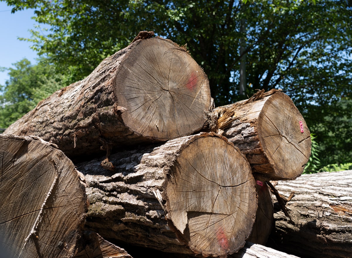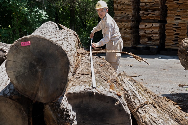 オークヴィレッジの家具は、広葉樹の木目や色を生かすため無垢の木を使用していますが、長い年月をかけて生長したナラやカバなどの広葉樹は、曲がったり、枝があったり、一本一本に個性があり、それが製品ごとに異なる表情を創り出しています。そのため、丸太から製材する際には、樹種ごとの木質、木目の出方、木目方向の伸び縮み度合いの違いやクセである木理(もくり)、曲がり具合などを見極めて、各製品のどの部材に適しているかを判断しています。