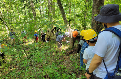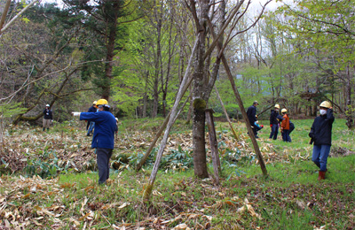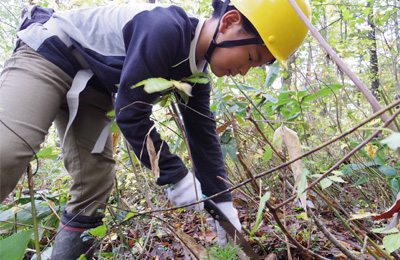 - 間引きする木を選定して、樹齢35年ほどの木の伐採を体験していただきました。