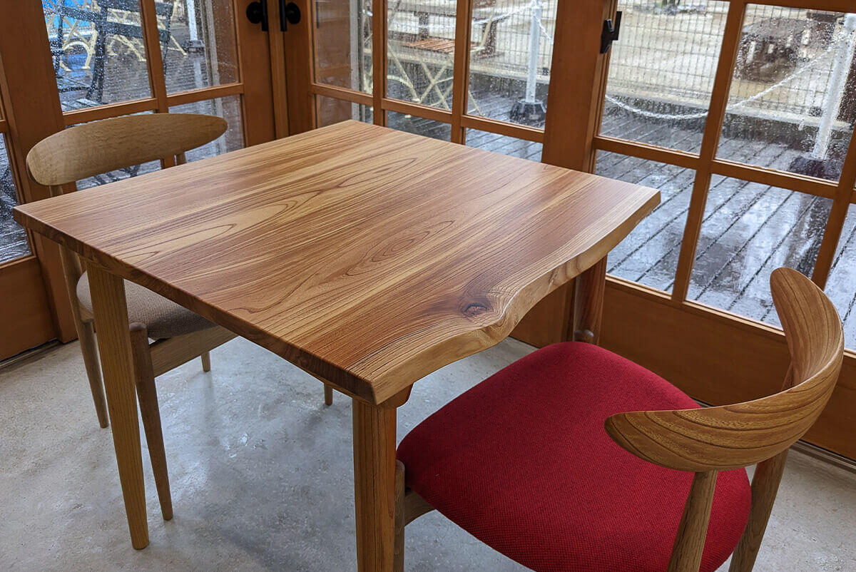 赤みがかった木肌や木目のコントラストが美しいテーブルセット。