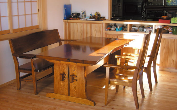 良質な国産材を用い、長年培ってきた職人の技術で造られた表情豊かな無垢材のテーブルは、永い「時間」とともに味わい深い経年変化をお楽しみいただけます。