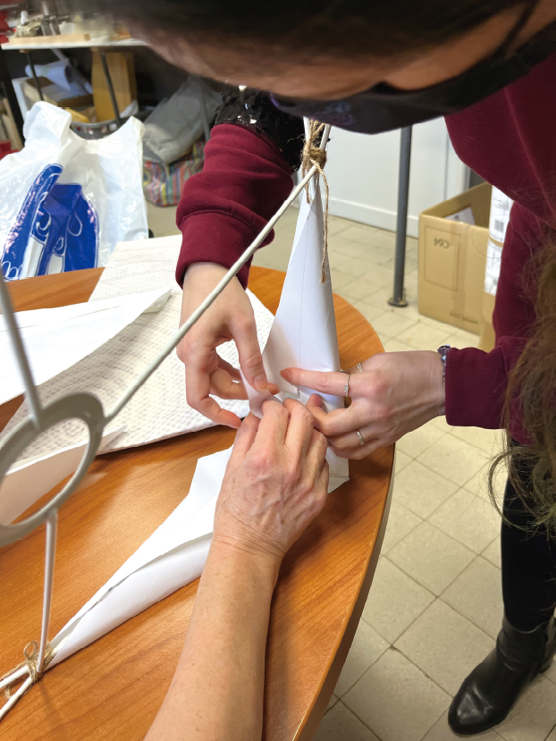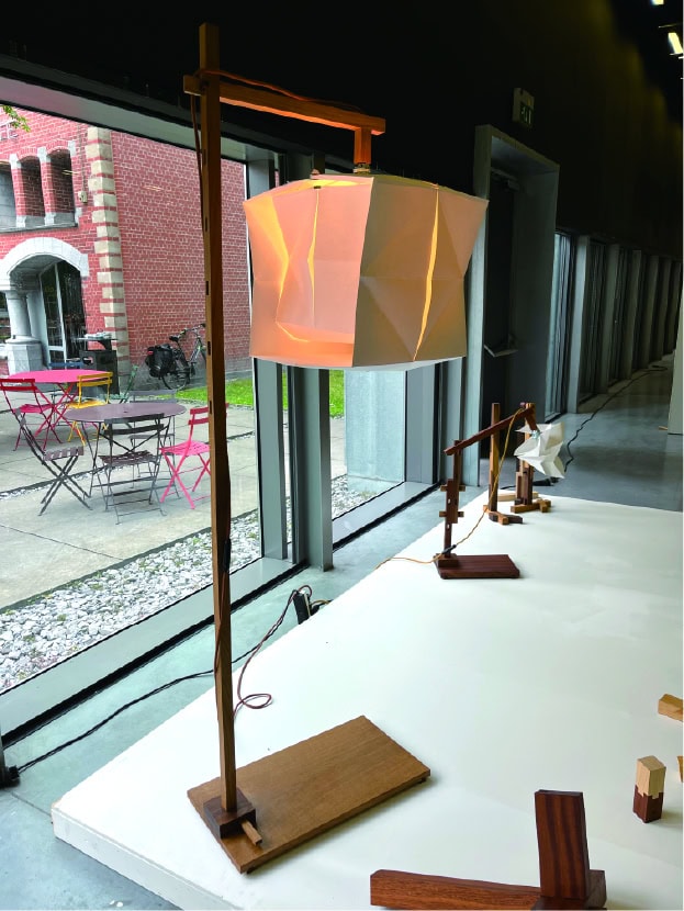 ランプシェードは、折り紙の技術を応用しながら、接着剤やテープなど使わず、折りたたみと組み立てだけで製作する努力をしましたが、完成形はまだ模索中で、ドイツの職人の方が漉かれた手漉き紙で最終製作の予定でしたが、産業紙での公開となりました。