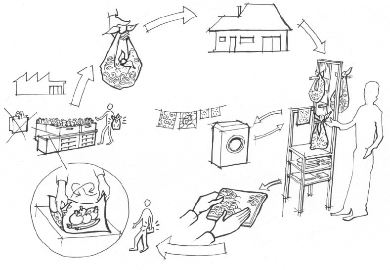 三つめは、パッケージや使い捨ての袋を減らし、布を使って、買い物の収納や運搬をサポートするインテリアの提案です。使い捨てのプラスチック袋や紙袋でなく、布を使い続けながら、店と自宅間の運搬、店と家での収納をサポートできないかと考えました。試作した収納棚はランプと同様の木組みの構成です。テキスタイルと袋のデザインは完成できなかったため、展示では、日本の風呂敷会社様の風呂敷をバック式に包んだ例を、合わせて紹介させていただきました。