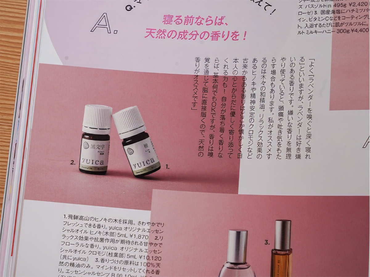 2月12日発売に発売されました「月刊 sweet 3月号(宝島社刊)」にて、yuicaの精油(クロモジ、ヒノキ木部)が紹介されました。