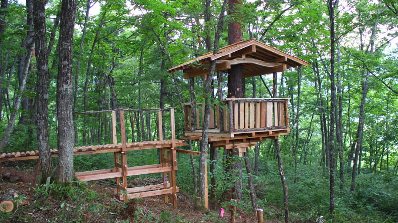 広葉樹、針葉樹さまざまな木々が育つ里山の奥に、かつてお客様と職人たちが一緒に建てたツリーハウス(展望小屋)があります。天気が良い日は、乗鞍連峰が一望できます。