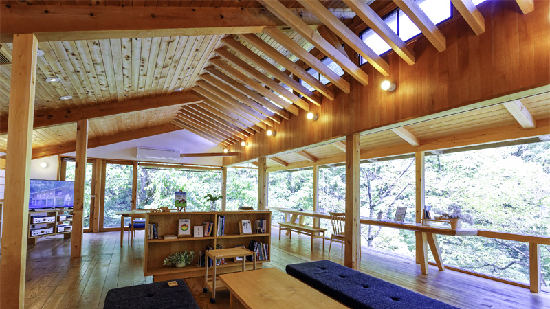 大きな窓一面に広がる森の景色。目の前にはせせらぎが流れ、桜の春、緑深い山の夏、紅葉の秋、雪景色の冬と、一日として同じ日は無い風景が楽しめます。
